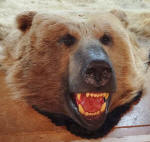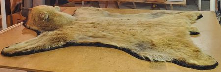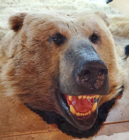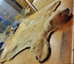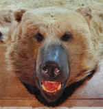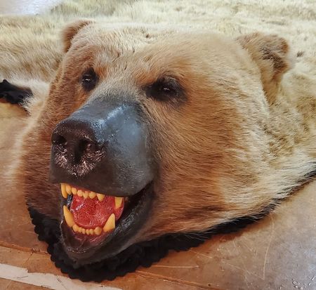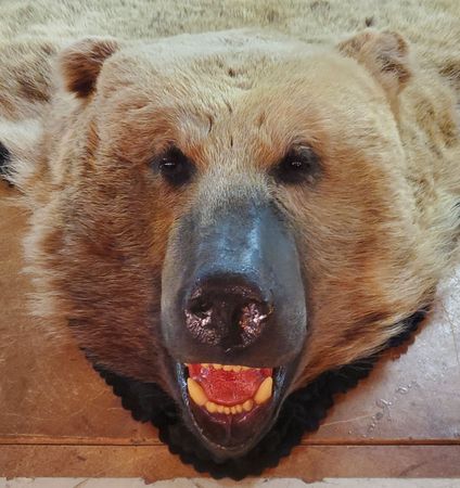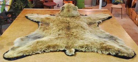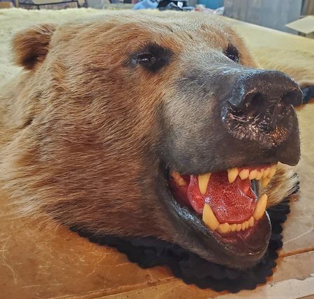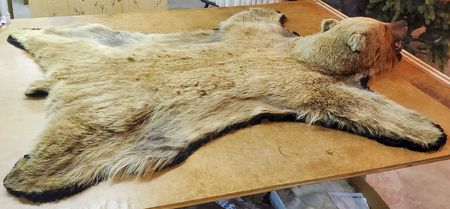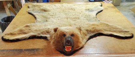 We always have a good selection of newly made grizzly bear full head rugs in stock. They are mounted with an open mouth. All our rugs have a double layer of heavy pleated felt borders and heavy denim backing. Our taxidermy workmanship is of the highest standard.